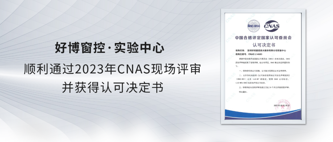 近日,好博窗控中心实验室以卓越的技术实力和严谨的管理体系,顺利通过了CNAS现场评审,并于2023年6月正式收到了CNAS认可决定书,认可结果为:通过!